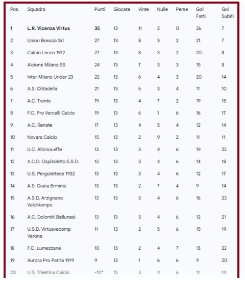 Vittoria alla U-Power Arena di Monza per il L.R. Vicenza, sgambettando i baby dell’Inter, e primato rafforzato. Fa il “suo” la squadra biancorossa, complicandosi la vita per l’espulsione diretta di Leverbe (con il rigore trasformato per il parziale 1-1) a inizio ripresa, ma alla fine riuscendo a battere ugualmente il team B milanese in un 13° turno in cui cadono entrambe per 0-1 le inseguitrici della leader del girone A di serie B. Un Lecco battuto in trasferta dal Novara e poi Union Brescia sgambettato sì a sorpresa ma fino ad un certo punto (gli arancioni sono quarti in classifica) dall’Alcione che si avvicina così al podio.