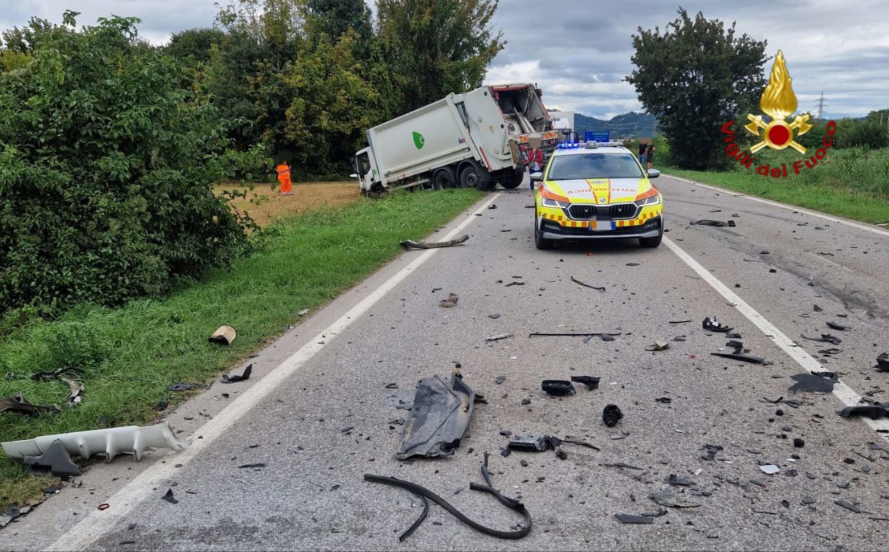 Frontale auto contro il camion dei rifiuti, interviene l’elicottero