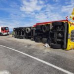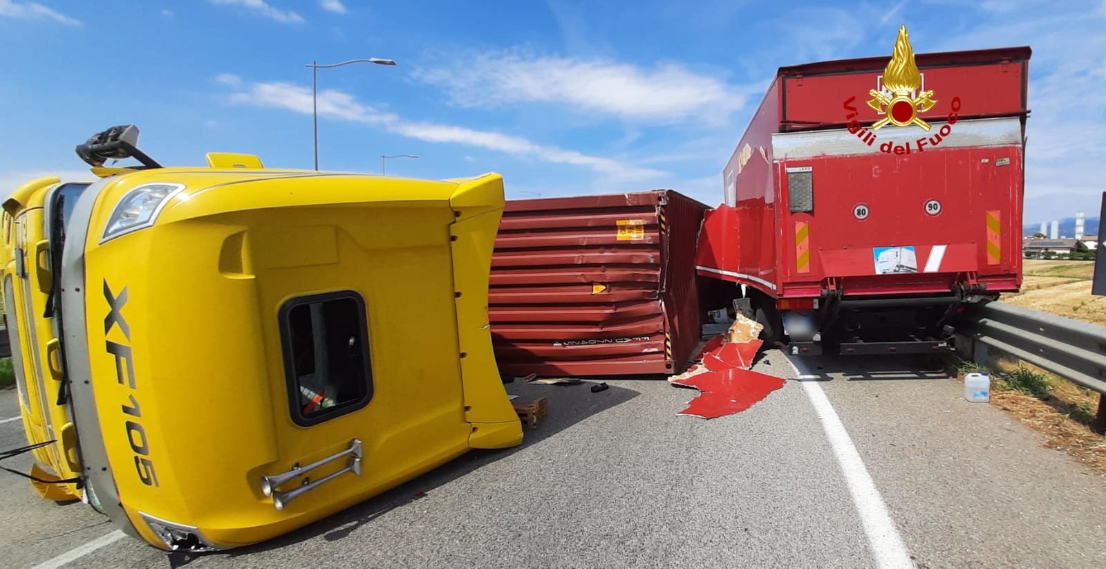 Incidente mezzo pesante-furgone, autoarticolato si rovescia sul fianco. Un ferito e traffico in tilt