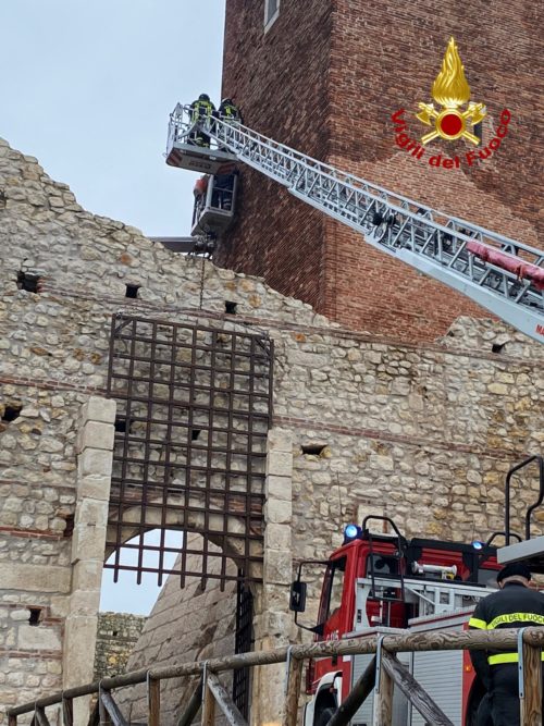 I due lavoratori stavano eseguendo la manutenzione del torrione, conosciuto come il castello di Giulietta, quando la piattaforma aerea a causa di un guasto è rimasta bloccata senza permettere nessuna manovra alle due persone. I vigili del fuoco intervenuti alle 15 da Vicenza con due squadre, hanno affiancato con il cestello dell’autoscala la piattaforma e trasbordato i due tecnici uno per volta portandoli a terra. Le operazioni di soccorso sono terminate dopo circa un’ora.