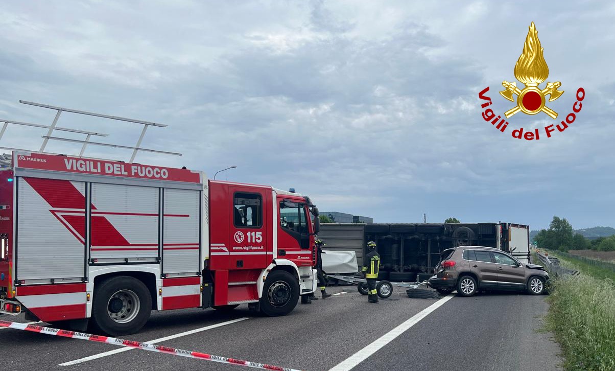 Traffico bloccato lungo la A4, tra gli svincoli di Montecchio Maggiore e Vicenza Ovest, per un autoarticolato finito rovesciato, di traverso sulla carreggiata, dopo essere entrato in collisione con un’auto. Nessuna persona è rimasta ferita.