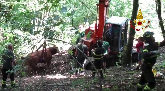 Per riuscire a trasportare verso monte il toro è stato fondamentale l’utilizzo di un argano, assicurato a un escavatore, con la collaborazione dei titolari di un’azienda agricola delle vicinanze, proprio i proprietari del manzo ormai adulto. La pendenza della porzione di monte, infatti, impediva al “cornuto” di risalire in autonomia il tratto scosceso e anche a chicchessia di trascinarlo a forza verso l’alto. L’ultima e unica soluzione, quindi, per evitare un letterale “macello”, rimaneva la chiamata ai vigili del fuoco, ufficiali di soccorso preposti anche al salvataggio di animali in difficoltà oltre che degli essere umani.