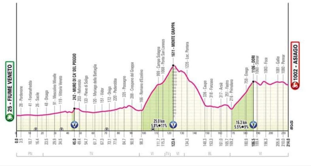 Il percorso risulta in verità già ampiamente noto, così come la data del 25 maggio, con il torpedone di atleti in bicicletta ad affacciarsi sull’Altopiano da Enego, con alle spalle la zona di Valstagna, per poi percorrere la strada provinciale attraversando i territori montani di Foza e Gallio prima del gran finale nel centro di Asiago. La partenza invece è fissata al confine tra Veneto e Friuli, da Fiume Veneto che si trova in provincia di Pordenone. Il Monte Grappa, sopra quota 1.600 metri, sarà la “cima” della tappa da valicare.