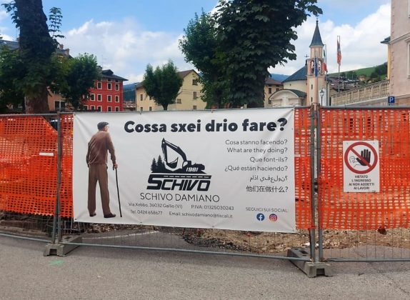 Fatto sta che proprio da qui è nata la “trovata” dei cartelli di cantiere ironici, con il fine di strappare un sorriso e stemperare gli animi per tutta la durata del work in progress. C’è proprio l’inglese tra le lingue proposte insieme a italiano, francese, spagnolo, poi arabo e giapponese, in ossequio alla globalizzazione. Va a sapere se manchi all’appello l’idioma tedesco per motivi di spazio o perché, si sa, il popolo teutonico preferisce l’Italia per i lidi marittimi. E un domani, magari, ci sarà il cimbro degli antenati tanto caro all’Altopiano delle origini. Oggi intanto, si osserva il cantiere come fa il “nonno di Gallio” virtuale che terrà dunque sott’occhio i lavoratori in un luogo centrale sì della vita pubblica locale, ma con limitate possibilità di ospitare grandi eventi pubblici, come spiega il sindaco Munari.