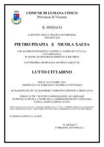 Il Comune di Lusiana Conco con l’avviso ha spiegato: “A seguito della tragica scomparsa dei giovani Pietro Pisapia e Nicola Xausa che ha profondamente colpito l’animo di tutta la cittadinanza. In segno di doveroso rispetto e ricordo con propria ordinanza ha proclamato il lutto cittadino per il 24 ottobre 2025, giorno in cui verranno celebrati i funerali. In ragione di ciò le bandiere verranno esposte a mezz’asta. Sono vietate le attività ludiche e ricreative e tutti i comportamenti e le iniziative che contrastano con il carattere luttuoso della cerimonia e con il decoro urbano”.