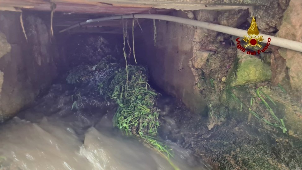 Strada allagata dai tappi di erba nella roggia di scolo: a “sturare” arrivano i pompieri