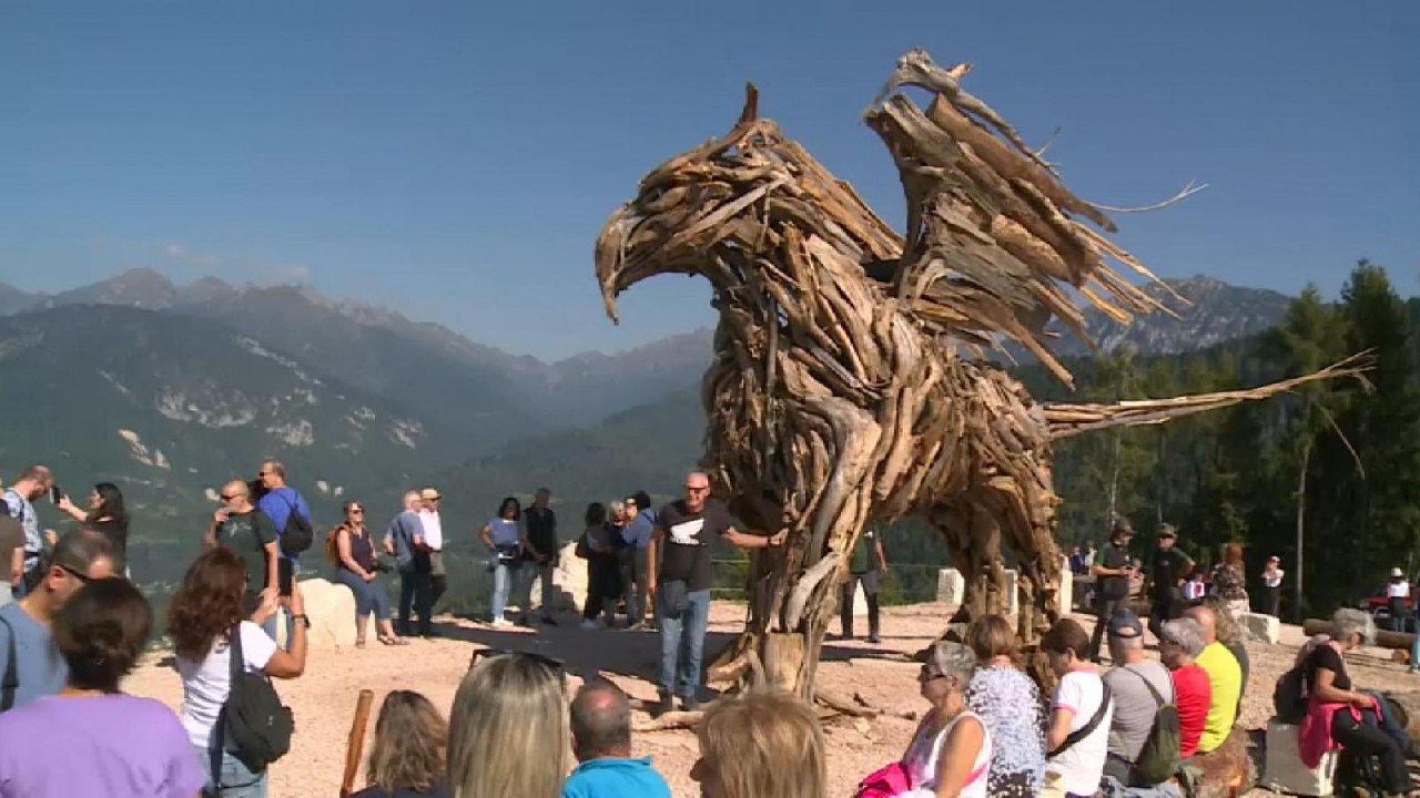 Il “Grifone Vaia” è stato inaugurato ieri al confine tra Veneto e Trentino, a Celado, nel territorio di Castello Tesino. È l’ultima opera dell’artista, che solo pochi giorni fa si è visto andare in fumo, in un incendio doloso, la sua opera più celebre, il “Drago Vaia” di Lavarone.