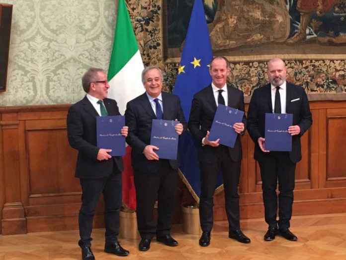 Palazzo Chigi, una pre-intesa fra le Regioni Veneto, Lombardia, Emilia Romagna da una parte e il Governo dall’altra sulle maggiori forme di autonomia chieste da queste Regioni. A sottoscrivere l’ “Accordo Preliminare in Merito all’Intesa Prevista dall’Articolo 116, terzo comma, della Costituzione tra il Governo e la Regione del Veneto” sono stati da un lato il presidente del Veneto Luca Zaia e dall’altro il sottosegretario alla Presidenza del Consiglio dei Ministri con delega agli affari regionali e le autonomie, Gianclaudio Bressa. Per la firma del pre-accordo con la Regione Lombardia era presente il presidente Roberto Maroni e per la Regione Emilia Romagna il presidente Stefano Bonaccini.