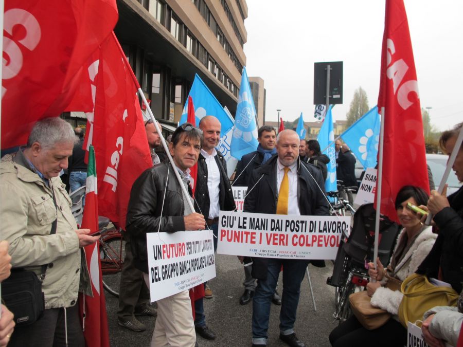 In attesa delle decisioni del Consiglio di amministrazione di domani e di un piano industriale per la Banca Popolare di Vicenza, stamattina è andata in scena la protesta dei dipendenti: c’erano infatti praticamente tutte le principali organizzazioni sindacali (anche la Uil, che inizialmente sembrava non partecipasse) stamattina in via Battaglione Framarin, all’assemblea che ha preceduto un presidio davanti all’ingresso della direzione generale dell’istituto bancario berico. Con lo slogan “siamo bancari, non banchieri”, i dipendenti hanno prima tenuto un’assemblea in Sala Pavesi e poi manifestato davanti alla sede principale della banca, chiedendo “soluzioni necessarie, urgenti ed equilibrate che restituiscano a tutti i dipendenti la dignità del proprio lavoro”.