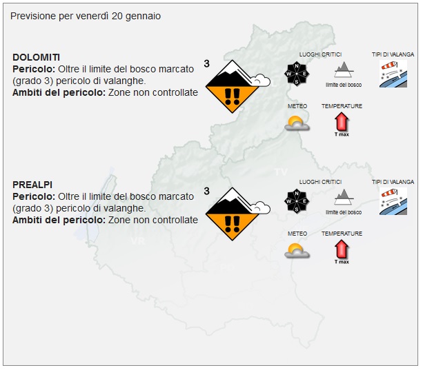 Il pericolo di valanghe in questi giorni sulle montagne venete è di grado 3 “marcato”, sia per le Dolomiti che per le Prealpi (qui il bollettino Arpav). Il Soccorso alpino e speleologico veneto ricorda che dato che da domani il tempo sarà in miglioramento, è probabile che con il vento la neve fresca e leggera degli ultimi giorni subirà una redistribuzione, specie oltre il limite del bosco, mentre la formazione e la distribuzione dei nuovi lastroni sarà in funzione all’intensità e alla durata dell’azione eolica.