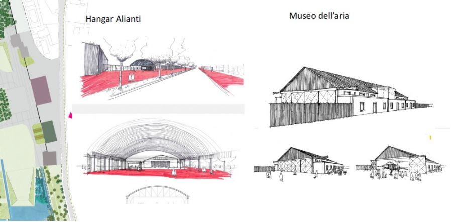 Il recupero della storia del luogo. Accanto all’acqua, il secondo elemento fondamentale del parco sarà il rapporto con la storia del luogo. Sono stati infatti previsti il recupero e la rifunzionalizzazione dell’hangar alianti come porta d’ingresso del parco e la messa in sicurezza e predisposizione dell’edificio che ospiterà il Museo dell’aria. E’ stata inoltre mantenuta la vecchia pista aeroportuale per ospitare grandi eventi e altre attività.