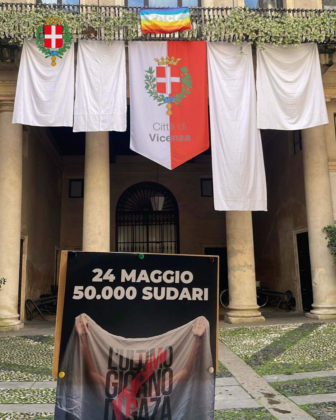 Questa mattina l’assessore con delega alle politiche per la pace Giovanni Selmo assieme ad alcune componenti della Casa per la Pace, al Capo di Gabinetto Sandro Pupillo e al consigliere comunale Elia Pizzolato, ha affisso nella corte di Palazzo Trissino quattro teli bianchi, lenzuola che alludono ai sudari che avvolgono, a Gaza, i corpi dei palestinesi uccisi dai bombardamenti israeliani.