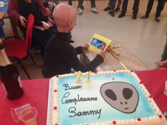 Torta “aliena” per Sammy Basso, il giovane di Tezze sul Brenta affetto da progeria (una malattia molto rara che provoca l’invecchiamento precoce). Sammy sabato sera ha partecipato a una festa a sorpresa, organizzata a sua insaputa dagli amici del gruppo teatrale “I mendicanti di sogni”: allegramente e fra gli applausi ha soffiato sulle candeline del dolce per i suoi 21 anni (video).