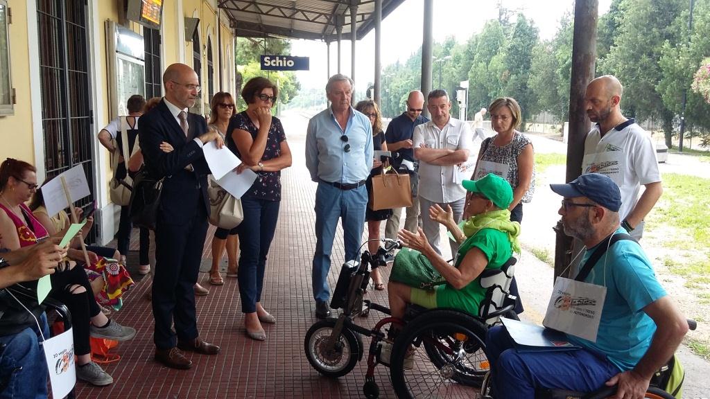 A toccare con mano stamattina i disagi che gli spostamenti in treno comportano, c’erano amministratori di Schio, Marano, Dueville, il sindaco di Villaverla Ruggero Gonzo e per la Provincia Mario Benvenuti, consigliere con delega ai trasporti. Con lo slogan “Io voglio prendere il treno in autonomia”, le associazioni hanno fatto presente a tutti come tutte le fermate ferroviarie da Schio al capoluogo non siano attrezzate per permettere l’accesso in autonomia al treno, in quanto manca la pedana che dovrebbe collegare la carrozza ferroviaria alla banchina. Nel denunciarlo, Fish Veneto (Federazione italiana superamento handicap) e Aniep Vicenza Onlus (Associazione nazionale per la promozione e la difesa dei diritti delle persone disabili) hanno ricordato come ciò contrasti con l’articolo 16 della Costituzione Italiana che sancisce e tutela la libertà di circolazione.