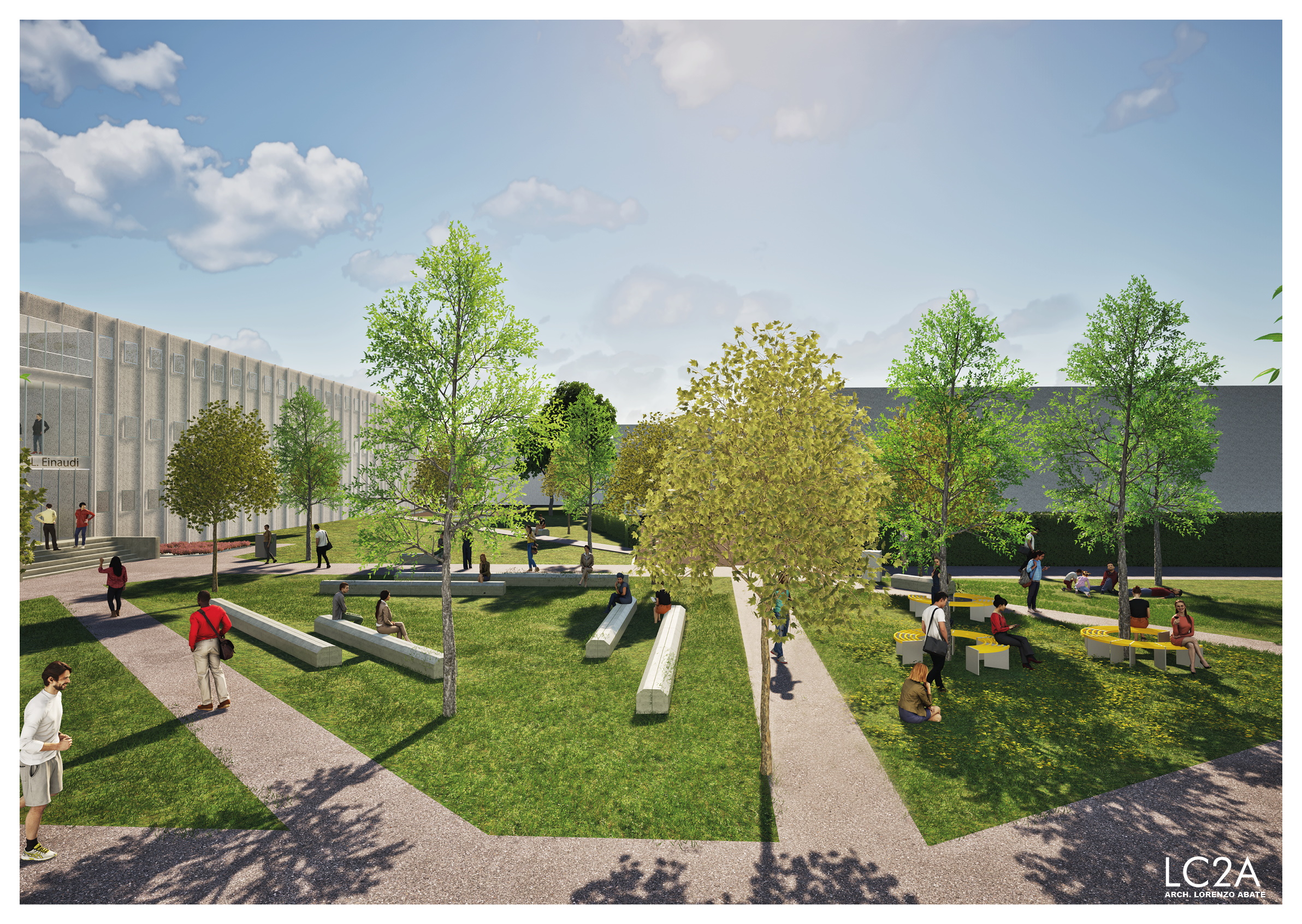 Per dare qualche numero, attualmente l’area esterna del centro studi occupa 11.800 mq, di cui solo 2.700 mq di area verde. Dopo l’intervento ci saranno 4.500 mq di verde e 700 mq di pavimentazione a marciapiede, con elementi di vegetazione e di arredo urbano che si alternano alle linee rette dei percorsi resi più efficienti. Proprio questi percorsi disegnano il punto centrale del progetto: uno spazio verde di forma triangolare, con sedute di arredo urbano, che insieme possono fungere da punto di sosta e polo attrattore di aggregazione e di supporto alle attività didattiche all’aperto.
