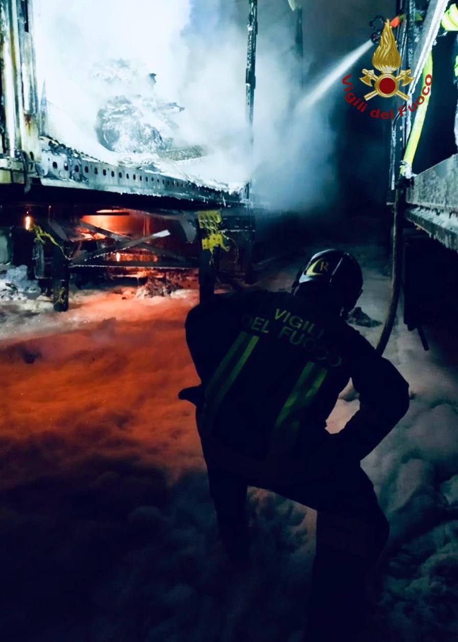 A fuoco dieci semirimorchi in un’azienda di trasporti. Ipotesi-dolo