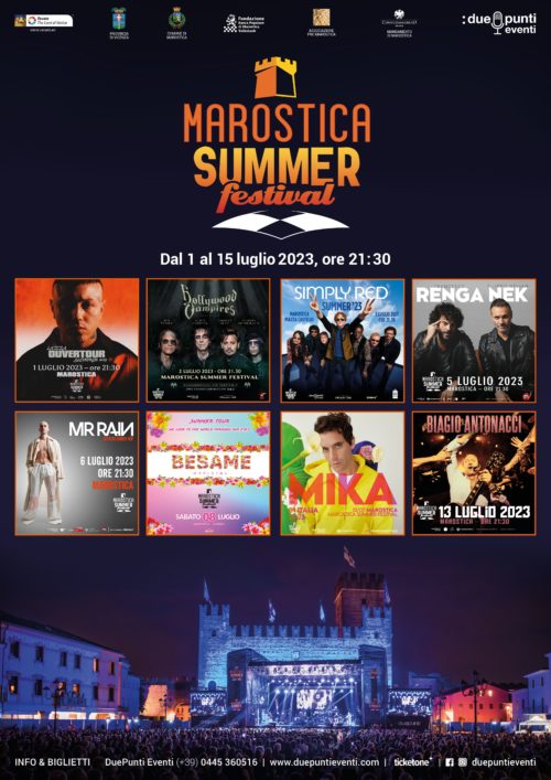 Star internazionali del rock e della pop music, grandi voci italiane e nuovi idoli della scena contemporanea. Marostica Summer Festival, organizzato da DuePunti Eventi in collaborazione con la Città di Marostica, giunge alla nona edizione, confermandosi uno degli appuntamenti più attesi dell’estate italiana, con produzioni uniche e artisti apprezzati da diverse fasce di pubblico.