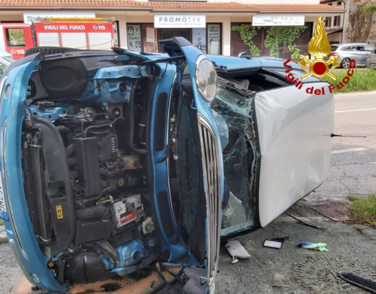 Mini Cooper ribaltata e semidistrutta dopo lo scontro sulla provinciale. Un ferito