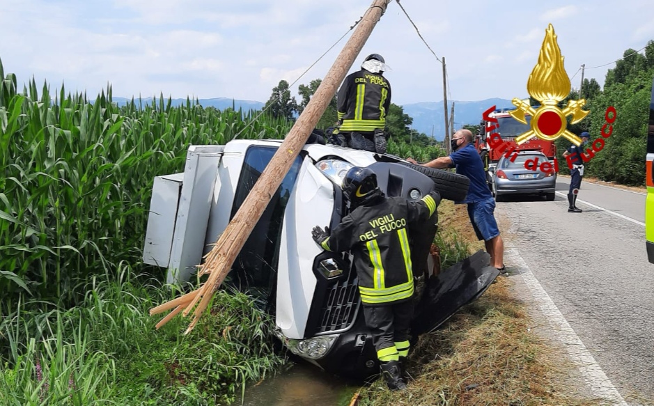 Alle 14.40, i vigili del fuoco sono intervenuti in Via Roncalli a Rosà per un furgone finito rovesciato fuoristrada, dopo la perdita di controllo del conducente rimasto ferito con un passeggero: abbattuto un palo telefonico.
