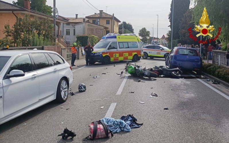 Terribile incidente stradale poco prima delle 13 di oggi (lunedì 16 ottobre) a Rossano Veneto: un centauro è rimasto gravemente ferito in uno schianto che ha coinvolto ben quattro mezzi: una moto, uno scooter e due auto. L’incidente sarebbe avvenuto durante una manovra di sorpasso.