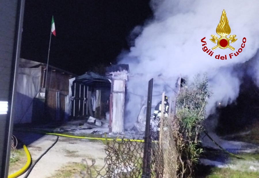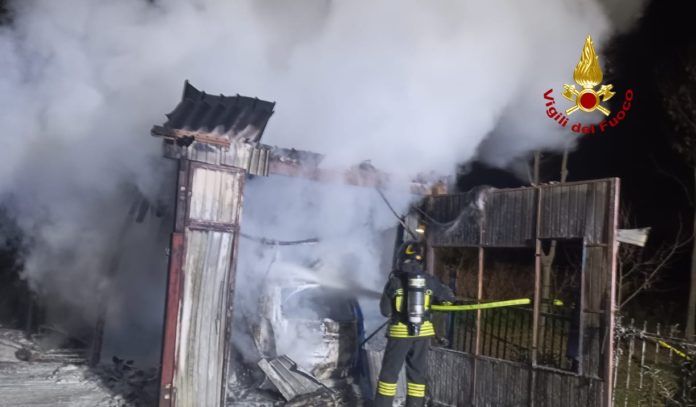 Baracca in lamiera avvolta dalle fiamme nella notte. Distrutte un’auto e una bicicletta