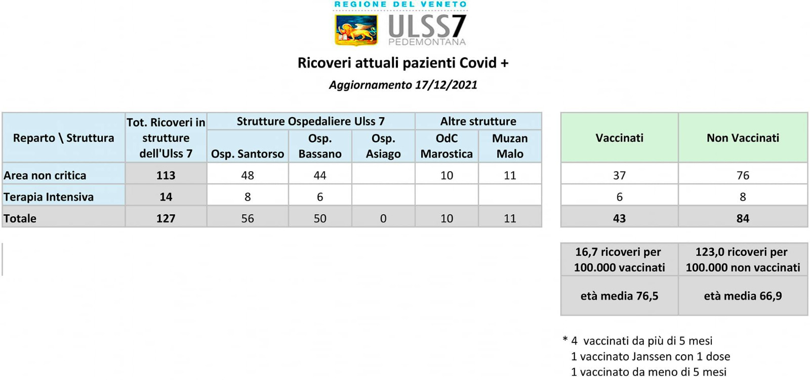 Intanto, i numero odierni segnano un ulteriore aumento dei ricoverati negli ospedali di Bassano, Santorso e nelle strutture secondarie di Malo e Marostica: sono 127, fra i quali sono saliti a 14 i pazienti che hanno bisogno di cure più impegnative, nei due reparti di terapia intensiva. Di questi 8 non sono vaccinati, con un’età media di 67 anni e una densità di ricoveri che raggiunge le 123 persone ogni 100 mila abitanti (mentre per i non vaccinati, l’età media è di dieci anni più alta e l’incidenza su 100 mila abitanti si ferma a 16). Complessivamente, i non vax ricoverati sono il doppio dei vaccinati.
