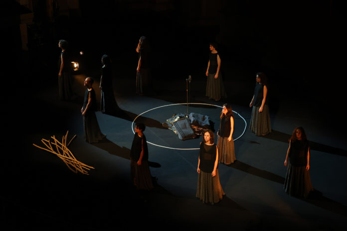 E’ uno spettacolo di corpo e visione, poesia e tempesta, tragedia che si fonde con suoni elettronici, luci stroboscopiche, corpi in movimento continuo: un sabba contemporaneo che somiglia a un rave sacro.
