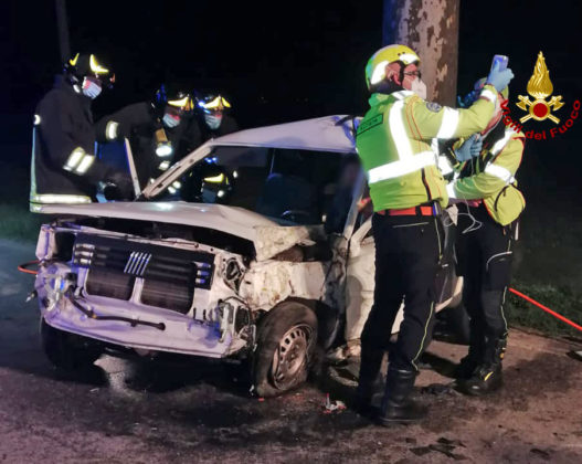 L’allarme è scattato ancor prima dell’albeggiare, stamattina intorno alle 5 nel territorio di Scaldaferro, frazione di Pozzoleone, lungo la provinciale Sp52 che collega l’area bassanese al capoluogo Vicenza. Di fronte ai soccorritori arrivati per primi sul posto uno scenario non semplice da digerire: un’auto bianca – un’utilitaria – devastata dopo aver sbattuto su un tronco a bordo strada, mentre all’interno si udivano i lamenti di una persona, intrappolata tra sedile e volante. A estrarlo dopo aver sezionato la carrozzeria con cesoie divaricatori e martinetti idraulici, per liberarlo, sono stati i vigili del fuoco giunti da Bassano del Grappa.