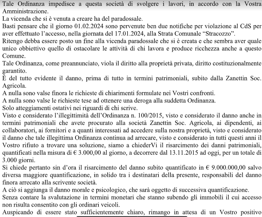 Il titolare di un’azienda agricola di Sandrigo, stanco di dover attendere risposte e permessi che insistentemente richiede da quasi un decennio, invia una raccomandata ai consiglieri comunali chiedendo 9 milioni di euro di risarcimento al Comune. Un calcolo che si base sulla cifra autodeterminata in 3 mila euro al giorno, e si tratta di denaro che continuerà salire nel conteggio da domani, chiesti al fine di compensare i “patimenti” e i danni arrecati da un’ordinanza comunale che impedisce a Francesco Zanettin – e ai suoi collaboratori – di raggiungere i suoi capannoni a bordo di auto o camion, in piena campagna.