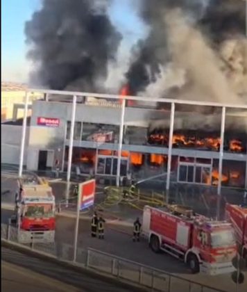 L’incendio, forse dovuto a un corto circuito nell’area dedicata alla ricarica dei carrelli elevatori, è scoppiato attorno alle 14 e sta interessando buona parte del magazzino e anche l’area aperta al pubblico.
