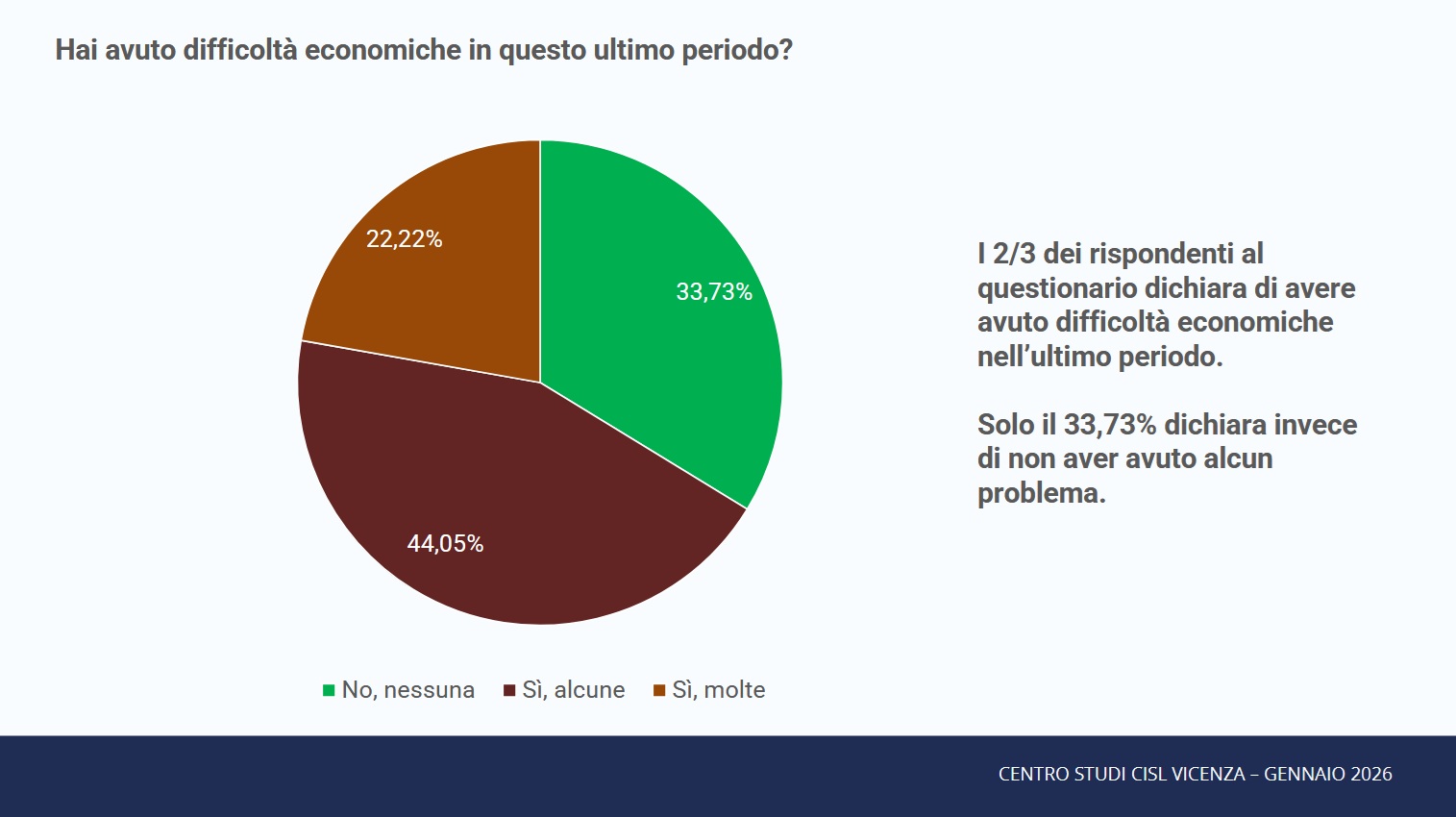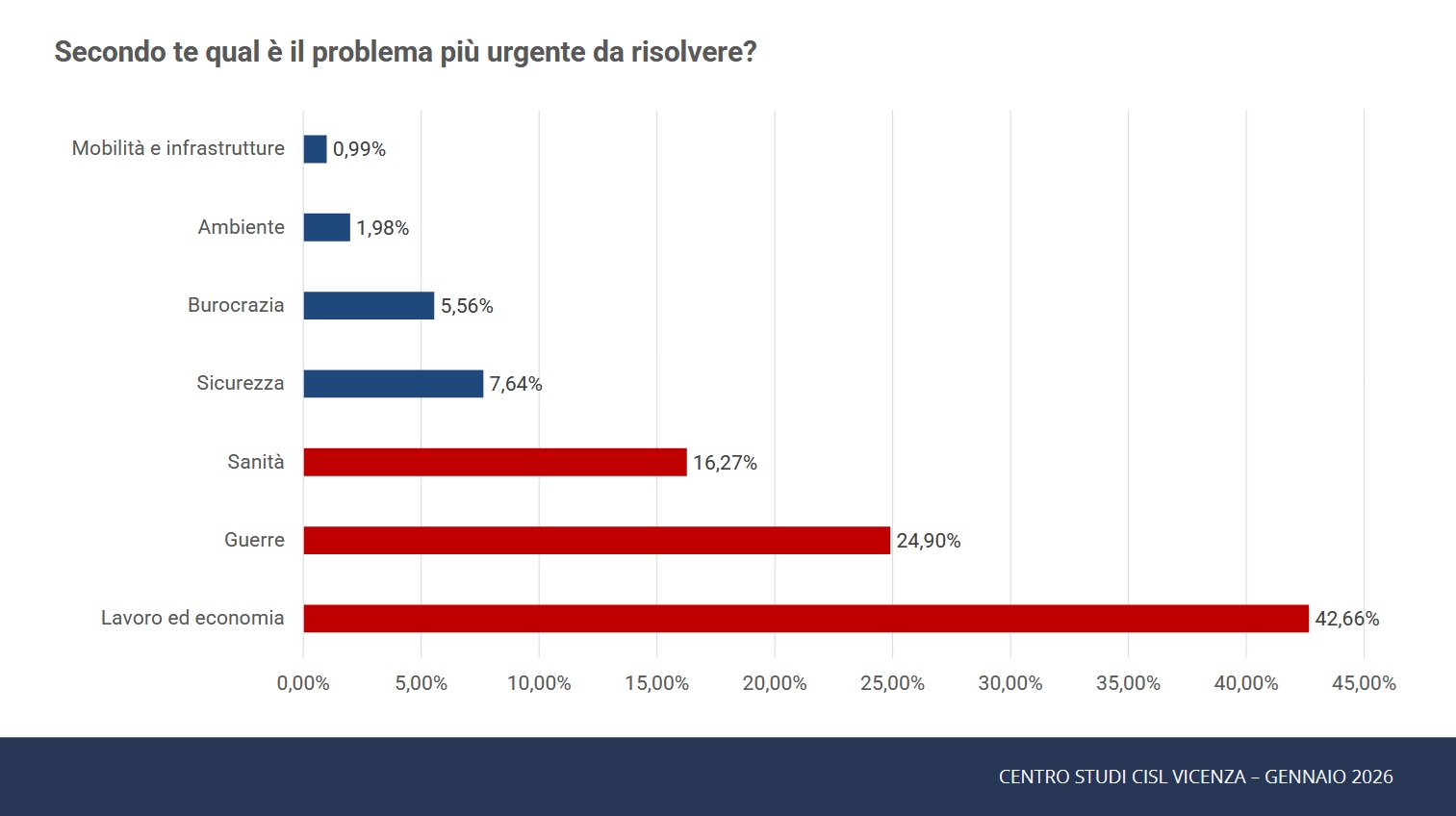 Il lavoro e l’economia sono il “problema più urgente da risolvere” per i lavoratori vicentini. È quanto emerge da una nuova indagine realizzata dal Centro Studi Cisl Vicenza su un campione di oltre mille lavoratori vicentini, ai quali è stato chiesto un giudizio sulle loro condizioni lavorative ed economiche e sulle loro aspettative per il 2026.