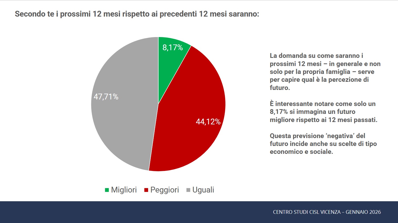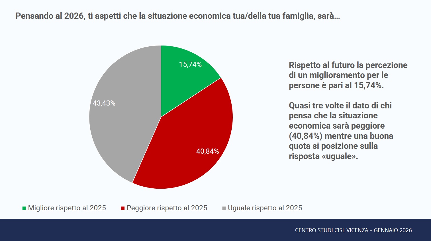 Interrogati invece sulle loro aspettative generali (dunque non solo relative a se stessi o alla propria famiglia) per il 2026, solo l’8,17% prevede un anno migliore rispetto al 2025, con un 47,71% che prevede una situazione sostanzialmente invariata e un significativo 44,12% che si attende un peggioramento generale. È curioso osservare come la stessa domanda fosse stata posta anche quattro anni fa, in una precedente rilevazione svolta dal Centro Studi Cisl Vicenza su un campione comparabile: all’epoca vi era stata una maggiore polarizzazione verso aspettative di miglioramento (14,9%) e peggiori (54,25%), a conferma di una sempre più diffusa incertezza nel contesto attuale.