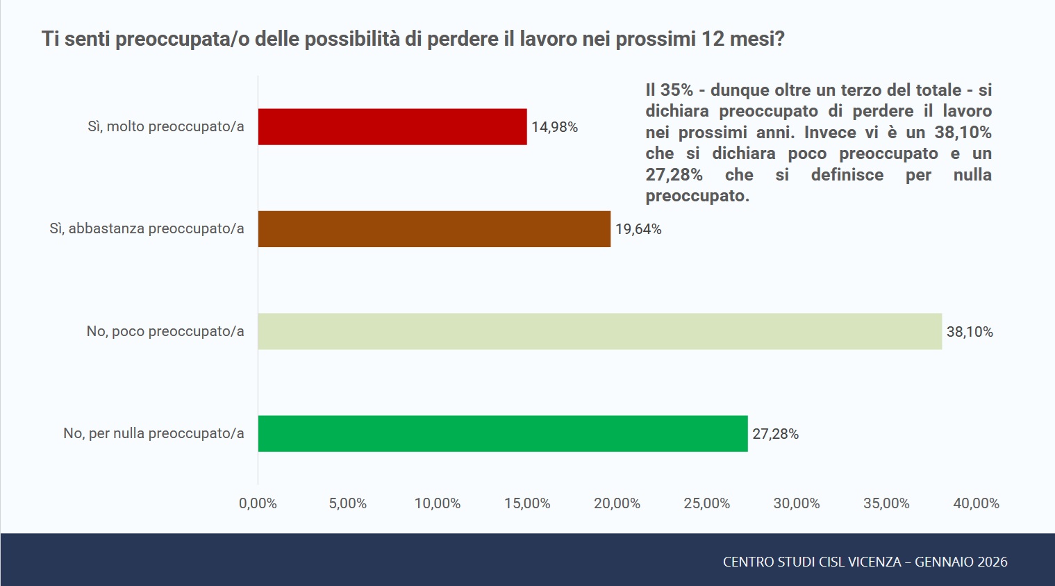 A fronte di queste criticità rispetto alla situazione economica, inizia a manifestarsi anche una certa paura per la perdita del lavoro: infatti se è pur vero che la maggioranza (65%) non manifesta questo timore, per un territorio ad alta densità di occupazione come quello Vicentino rappresenta un dato anomalo e preoccupante che oltre un terzo (35%) abbia motivi per ritenere il proprio posto a rischio nei prossimi 12 mesi: più in dettaglio il 19,64% si dichiara abbastanza preoccupato e addirittura il 15% molto preoccupato.