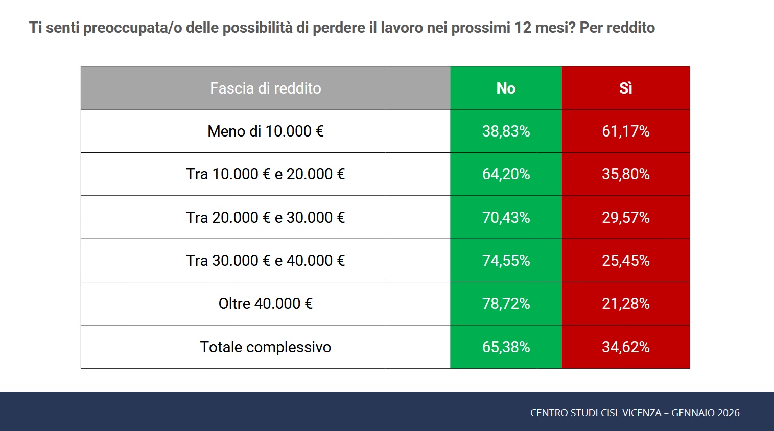 Anche in questo caso le risposte sono differenziate in base al reddito: ad esprimere maggiore preoccupazione sono le fasce più deboli (è preoccupato di perdere il lavoro nei prossimi 12 mesi il 61,17% di quanti hanno un reddito entro i 10 mila euro) ma oltre 1 vicentino su 4 della classe media ha lo stesso timore (oltre il 25% dei rispondenti con reddito fino ai 40 mila euro) e anche un 1 vicentino su 5 con reddito medio-alto (oltre i 40 mila euro) esprime la medesima preoccupazione, a conferma di come l’insicurezza del lavoro sia oggi un tema sempre più trasversale anche nel tessuto sociale vicentino.