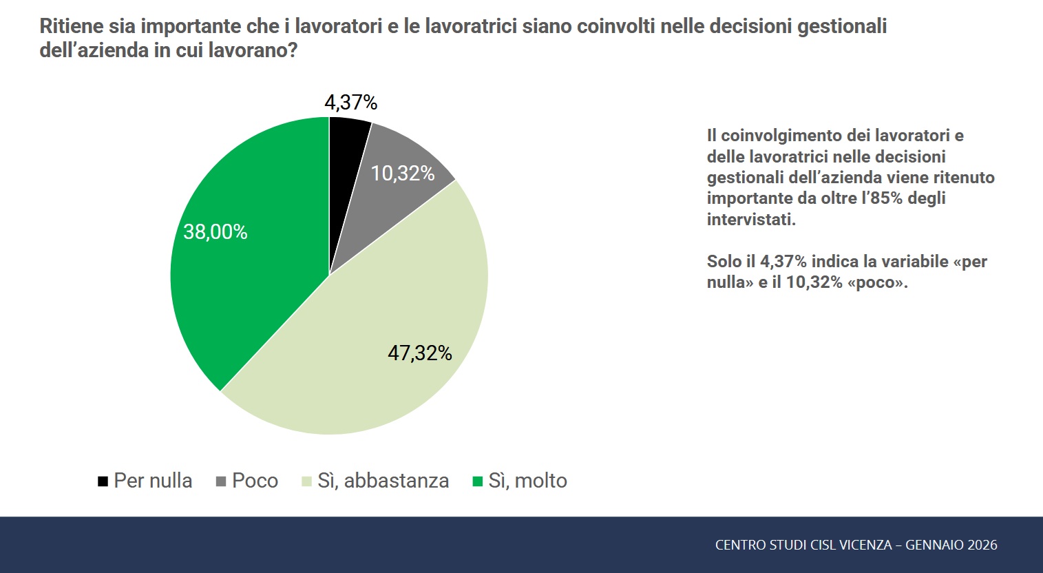 In questo contesto un ruolo decisivo dovrà avere anche la partecipazione dei lavoratori e delle lavoratori nelle decisioni gestionali delle aziende: questa opportunità, sancita dalla legge approvata nel 2025 a seguito della proposta di legge popolare presentata proprio da Cisl, è ritenuta importante da oltre l’85% degli intervistati.