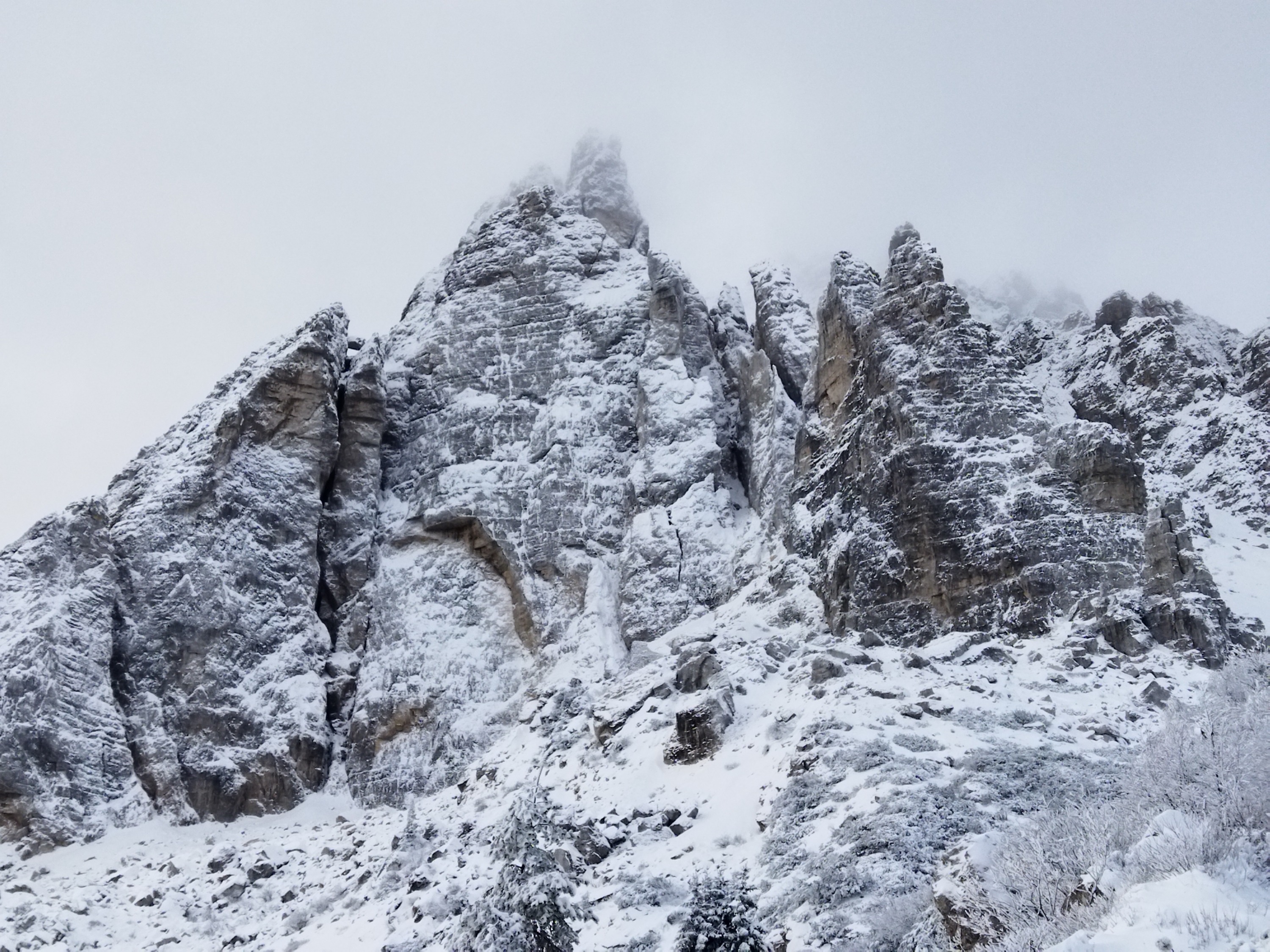 Non resta quindi che salire diritti verso l’imbocco del vajo, cercando le linee di neve più consolidate per facilitare la progressione. Alla propria sinistra si delinea il profilo frastagliato delle Guglie della Scala: da valle verso monte si distinguono il Milite, la Guglia Gei, la Guglia Negrin, il moncone della Guglia Piccola recentemente crollata e il Corno.