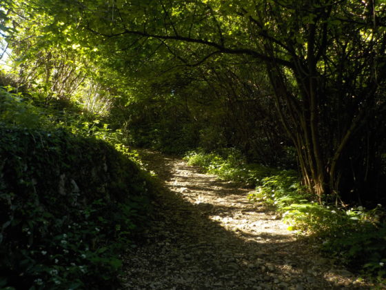 Proseguendo si incontra un bivio dove si tiene la sinistra per risalire nel bosco dove si incontrano diverse specie arboree come il castagno (Castanea sativa), il carpino bianco (Carpinus betulus), l’acero di monte (Acer pseudoplatanus) e il ciavardello (Sorbus torminalis). Il sottobosco invece è un alternarsi di profumato aglio orsino (Allium ursinum) e tappeti di epimedio (Epimedium alpinum).