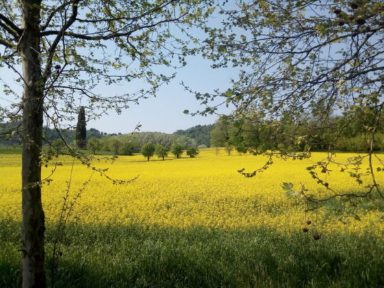 Il panorama dalla Riviera Berica è mozzafiato: la collina sulla quale poggia la villa cinquecentesca progettata dall’architetto Andrea Palladio è coperta dalla colza in piena fioritura. E l’effetto è spettacolare.