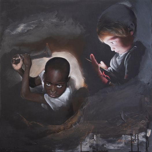 “Quest’opera – spiega la pittrice – è nata per dare voce a tutti quei bambini che ogni giorno lottano per avere una vita serena“. Il quadro infatti rappresenta due bimbi che sono due facce della stessa medaglia: da una parte il volto di un bambino-lavoratore che in un paese africano è costretto a lavorare nell’estrazione di minerali rari, dall’altra un bambino europeo che ha in mano un cellulare, che quei minerali li contiene.