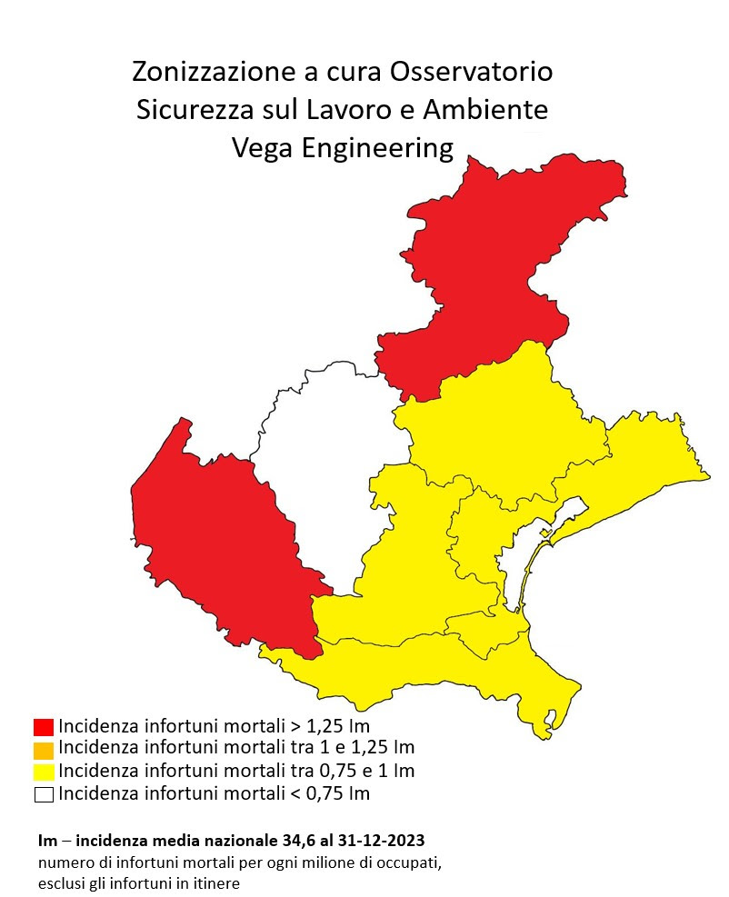 La zona gialla, quella in cui è entrato il Veneto a fine agosto 2023, è la zona che, subito dopo la bianca, raggruppa le regioni con l’incidenza di mortalità sul lavoro tra le meno elevate a livello nazionale. E a fine dicembre 2023, il rischio di infortunio mortale in Veneto (33,6 morti per milione di occupati) risulta di poco inferiore alla media nazionale, pari a 34,6.