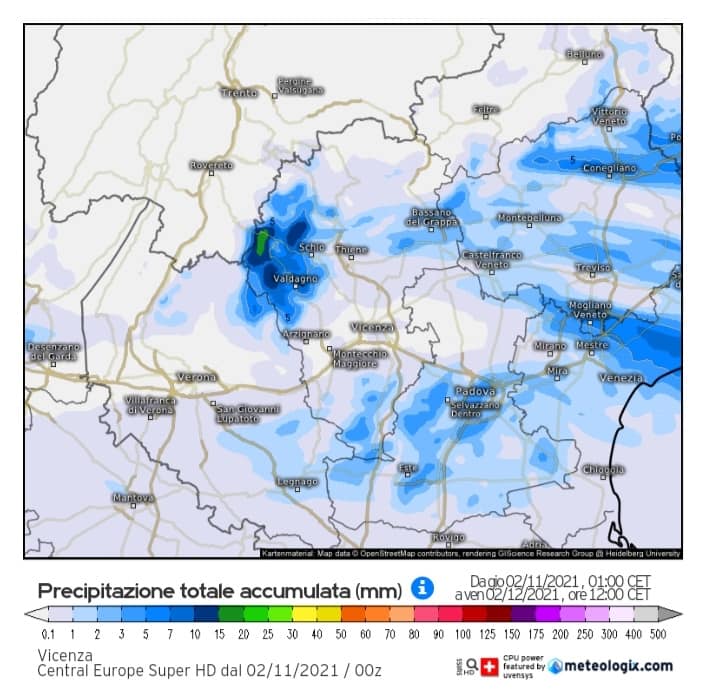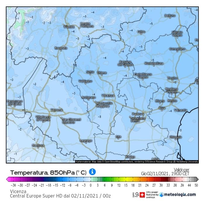 Da questo pomeriggio avremo nel Vicentino l’ingresso di aria relativamente fredda di origine continentale: in poche ore alla quota di 1400 metri circa si passerà da una isoterma di 0° a una di -7°.