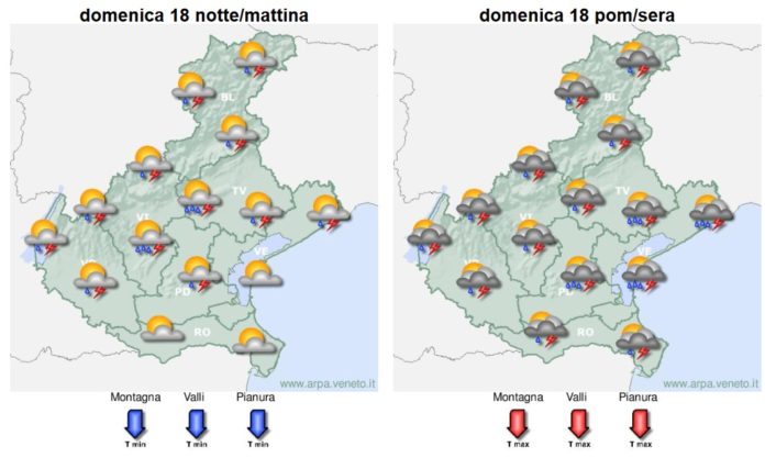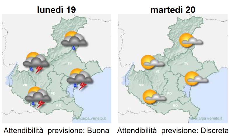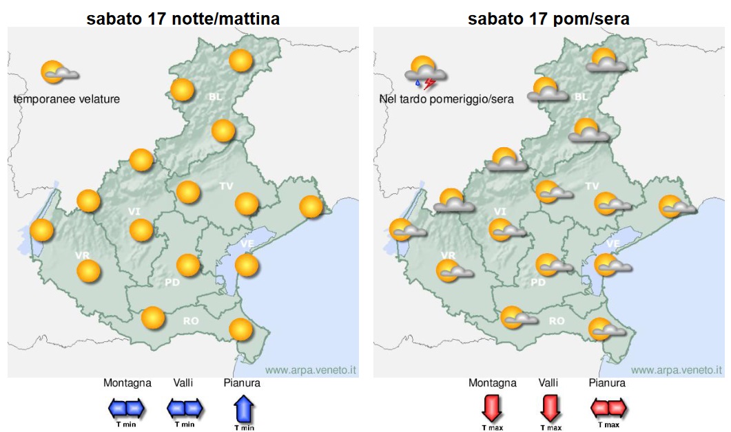 Precipitazioni: In pianura generalmente assenti, salvo al più sporadici piovaschi o brevi rovesci temporaleschi dal pomeriggio in poi sulla fascia pedemontana; in montagna fino al mattino assenti e poi probabili piogge sparse anche a carattere di rovescio o temporale.