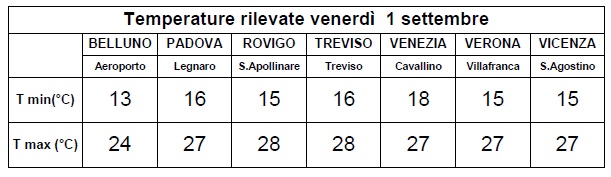 Non si verificheranno precipitazioni, cielo sereno o poco nuvoloso, temperature senza variazioni di rilievo eccetto diminuzioni di notte sulla pianura.