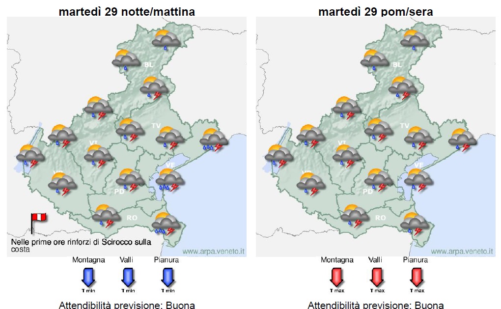 AVVISO METEO: Dal pomeriggio di lunedì 28 alla mattinata di martedì 29 tempo instabile/perturbato con precipitazioni da sparse o a tratti diffuse anche a carattere di rovescio o temporale. Saranno probabili fenomeni localmente intensi specie in riferimento a forti rovesci anche ripetuti o persistenti con quantitativi di precipitazioni consistenti. Dal pomeriggio di martedì fenomeni in diradamento e attenuazione a partire dalle zone montane.