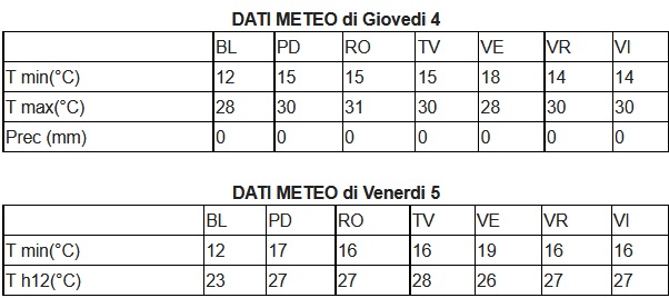 Temperature. In quota, moderato calo specie riguardo ai valori massimi; nelle valli e sull’alta pianura prevale una lieve diminuzione, salvo locali modeste controtendenze delle minime; altrove minime stazionarie o in leggero aumento, massime senza notevoli variazioni.