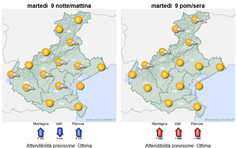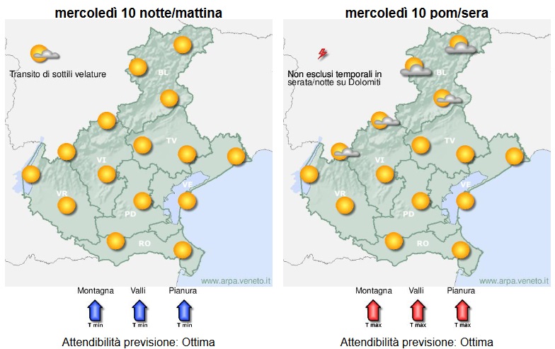 Cielo in pianura sereno o poco nuvoloso, in montagna dapprima sereno o poco nuvoloso e poi parzialmente nuvoloso per un po’ di cumuli sparsi associati alla possibilità di qualche piovasco o rovescio anche temporalesco; per le temperature sono attese contenute variazioni di carattere locale, tra cui alcuni aumenti delle minime.