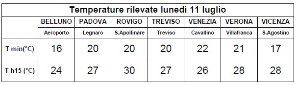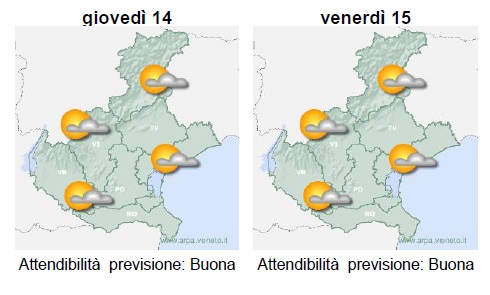 Giovedì 14 luglio. Cielo in prevalenza poco nuvoloso, anche se agli spazi di sereno si alterneranno alcuni addensamenti; a partire dalle ore centrali sarà possibile qualche rovescio o locale temporale sulle zone montane; temperature in aumento, specie in montagna riguardo alle minime e specie sulle zone sud-occidentali riguardo alle massime.