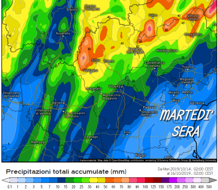 La giornata sulla nostra provincia inizierà con nubi basse. Solo in quota e sul basso vicentino troveremo ancora un pò di sole. Copertura nuvolosa in intensificazione dal primo pomeriggio con possibili deboli fenomeni in pianura. Fronte temporalesco in arrivo nel tardo pomeriggio/sera con forti rovesci sulla fascia pedemontana vicentina, dove si registreranno picchi di 50-60mm di pioggia in poco tempo. In pianura invece cadranno dai 15 ai 40mm. Cessazione dei fenomeni in nottata. Temperature massime in diminuzione.