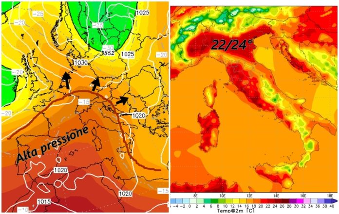 Altra giornata soleggiata dal clima gradevole. Si rinforza l’alta pressione, correnti miti da sud ovest porteranno le temperature massime in pianura a toccare i 24 gradi. Valori termici nelle medie del periodo.
