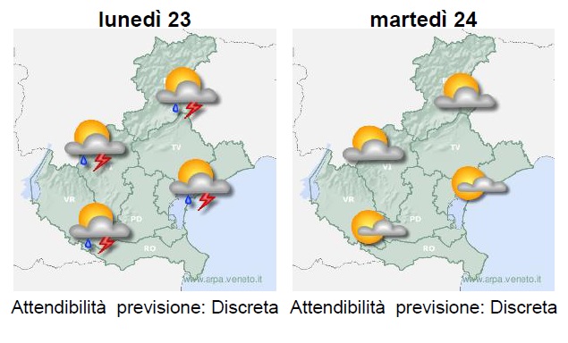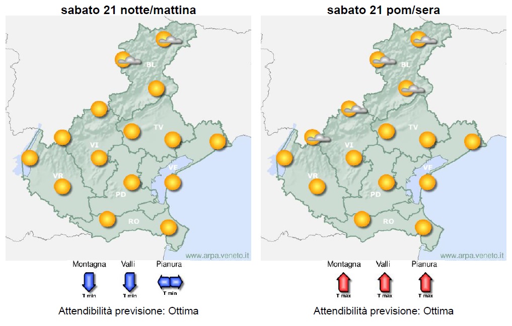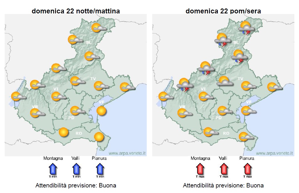 In pianura, prevarrà un cielo da poco a parzialmente nuvoloso con ampi spazi di sereno; in montagna il tempo sarà variabile con significative schiarite alternate soprattutto nel pomeriggio a nubi sparse e locale instabilità, associata ad una maggior probabilità di piogge sparse anche a carattere di rovescio o temporale; le temperature minime perlopiù diminuiranno, le massime in pianura generalmente aumenteranno e in montagna subiranno contenute variazioni di carattere locale.